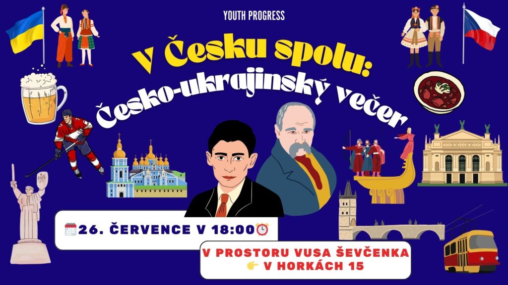 Toto léto Youth Progress přináší výjimečnou příležitost k příjemnému společenskému setkání a kulturnímu poznávání – dorazte na večer, kde se Češi a Ukrajinci opravdu potkají – nejen u jednoho stolu, ale i v příbězích, jazyce, zvycích a humoru. V rámci akce ‚V Česku spolu: Česko-ukrajinského večera‘ poznáte své sousedy, nové přátele a kulturní bohatství, které vzniká tam, kde se dvě země chtějí slyšet. Vstup je zdarma a můžete se těšit na skvělý program v ještě lepší společnosti!