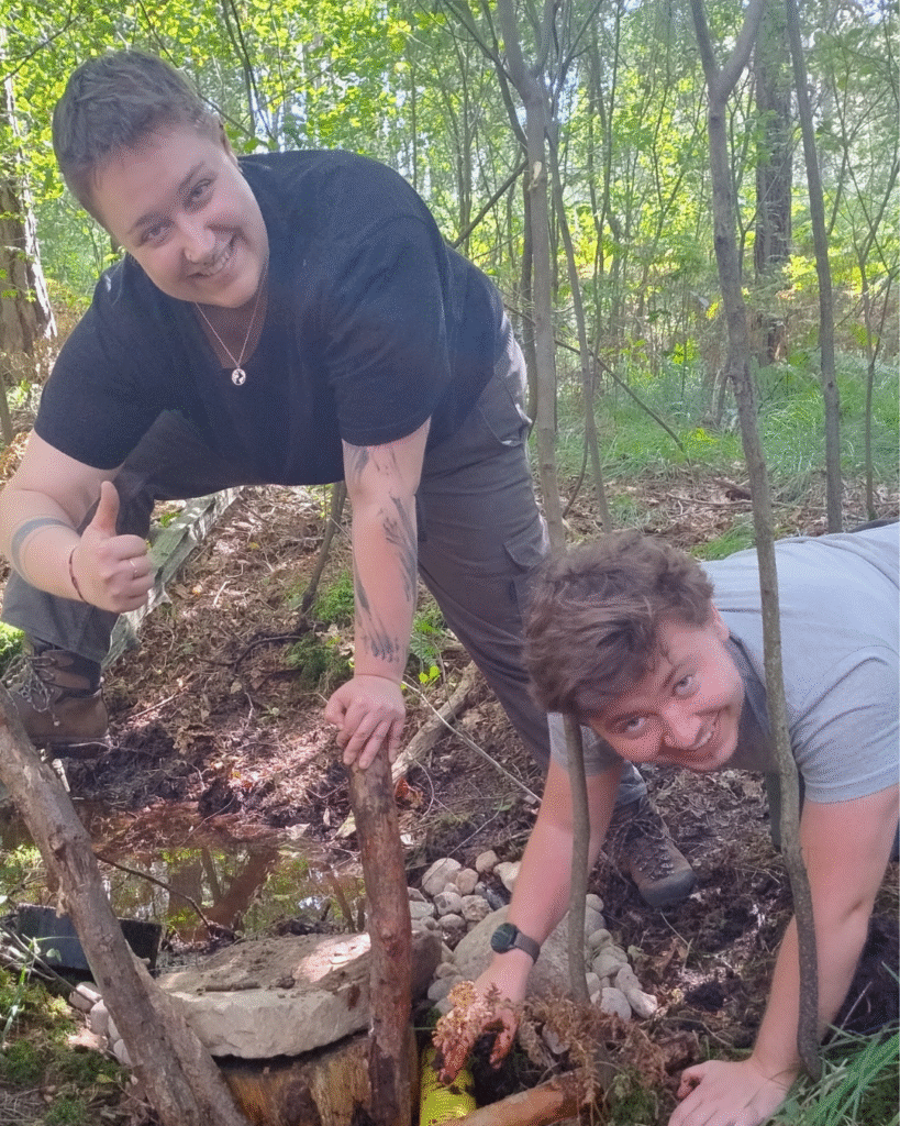 Main activities included physical work in the forest as we were working for four days on restoration of the wetland. It is important to maintain wetlands as they are crucial for maintaining biodiversity and combating climate change. With great dedication, we dug ditches, erected walls made of wooden posts (black locust from the forest) and then sealed them with clay, sand and stones. This resulted in a total of five new seals made of natural materials that retain water and enable the formation of new moorland areas. The improvement was visible within a few days.