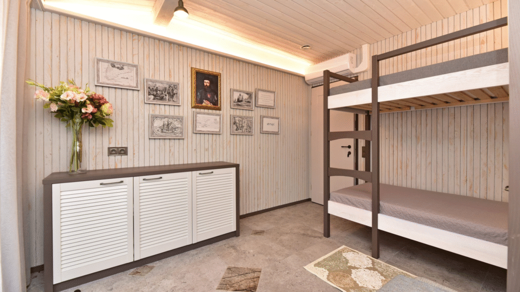 Each room will be equipped with basic furniture (beds, bedding, towels, storage space).